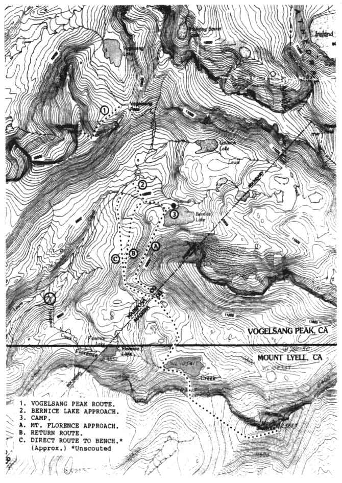 MT. FLORENCE By Bernice Lake exploratory routes Climbing team members for Vogelsang Peak (11,516') in Yosemite National Park were Doris Gilbert, Jack Barrett, George Denny, Vance Handley and myself. Only Vance and I attempted Mt. Florence (12,561 '). The 7.5' quadrangle maps used were: Vogelsang Peak, CA, and Mount Lyell, CA. George backpacked to Fletcher Lake adjacent to Vogelsang High Sierra Camp, Tuesday, July 7th~* The rest of us stayed at Tuolumne Meadows High Sierra Camp that night, which cost $96.00 for a four person tent cabin, towels and shower facilities included. We had dinner and breakfast there. Tel. (209) 372 8413. From the Dog Lake parking lot near Tuolumne Meadows High Sierra Camp, we connected with the John Muir Trail, then Rafferty Creek Trail, as we backpacked to Fletcher Lake on Wednesday, making camp with George. There are bear boxes for campers to use and we also had canisters, but two bags of trail mix were accidentally left in one of our backpacks. The resident bear had a real treat that night. The only damage to the open, in mint-condition, classic Kelty, was a torn baffle. On Thursday, with Vance and I backpacking, the five of us took the Vogelsang Pass Trail up to the tiny snow-fed rivulet at the base of the east ridge of Vogelsang Peak, the beginning of our climb. Doris had found the route information on Summitpost.org. The route took us below the east ridge, up a snow filled couloir and onto a short pitch of class 3 rock at the summit. It was a delightful climb with exceptional views, including those of Half Dome and Clouds Rest. (Trekking poles without snow baskets were used. Depending on snow conditions an ice axe and crampons could be needed.) We separated back down on the Vogelsang Pass Trail. George, Jack and Doris first went the short distance to the Pass for the sublime view; then they returned to Fletcher Lake to backpack out on Friday. Doris had made telephone reservations for Jack and her to have dinner and breakfast at Vogelsang High Sierra Camp, $50.00 per person. She later said the meals were excellent. Vance and I headed south over Vogelsang Pass, down the Lewis Creek Trail, destination Bernice Lake. We were seeking to fmd a more direct route to Mt. Florence, with less distance and gain than any documented one known by me, including Florence Creek. Bernice Lake is in a beautiful setting, and can be reached in slightly less distance than on trail, by heading uphill just beyond where Lewis Creek Trail crosses the outlet stream. We had the lake to ourselves for two of our three nights there - except for mosquitoes. We scouted the initial part of our exploratory route on Friday; then I went fishing, which was good for ten inch Brookies using spinners. Believing that my fishing rod was lost, one of my trekking poles was utilized. I keep about three feet of duct tape wrapped around the right pole to easily identify it from left, and for certain types of repairs. A few inches was used to join the spinning reel to the pole. A hole for the line was fashioned by bridging the wide, round-bottomed slot in the poles basket, also with duct tape! Good casts could be made with the contraption. My rod turned up after fishing. The couple of trout not released by me were prepared for dinner by cutting them into small pieces (small pot) sealing in foil, and cooking for about twenty minutes in boiling water. The trout was good, but with seasoning it would have tasted even better. Vance's Alpine Aire freeze-dried Potatoes and Cheddar with Chives, combined well. Traveling at a slow to moderate pace we started for Mt. Florence at 8:00 a.m. on Saturday. We traversed very gradually up to the crest of the ridge south of Bernice Lake; at first on smooth terrain, then talus for much less distance than expected, then on scree. We continued contouring up on the south side of the ridge to about 10,600 feet, seeking a way down the unexpected cliff beneath us. The band of cliff is mainly composed of large sheets of smooth granite inclined roughly, sixty degrees. Our descent route of about 200 feet to the small unnamed lake at the cliff base, was the only questionable part of our peak approach, intended to be no higher than class 3. An easier way down the formation may exist. From the cliff we went toward the couloir on the south side of Lake 10,541', located above Florence Lake. At that lake we converged with the Florence Creek approach to Mt. Florence. We were 3 brs 10 minutes from camp, and took a thirty minute break to rest and eat. There is large talus solidly lining the south shore of the lake, and up the whole couloir. The scree at the saddle soon gave way to big talus as we climbed toward the summit. The talus extended clear to the Southwest Ridge of Mt. Florence, was unexpected, and slowed our progress even more. At 6 hrs 45 minutes from camp, only about 800 vertical feet and one-half mile short of our goal, we stopped. After taking 45 minute to rest and feel the serenity, we headed down at 3:30 p.m. We switchbacked down a band of snow in the couloir, using our trekking poles for aid, and retraced our route to the small unnamed lake near the base of the aforementioned ridge cliff band. Instead of attempting to climb the cliff by our descent route or fmd another way up, we used our planned alternate approach to the peak in reverse. Hugging the cliff, we hiked west to the base of ridge buttress, then contoured down to the northern end of the bench below it and Bernice Lake, dropping, altogether, about 600 feet. We then continued north gradually up to the Bernice Lake Trail, reaching it at 9:00 p.m. at dark. We were in camp 13 hrs 10 minutes after leaving. Planning such a late start had cost us the peak, but it still was an enjoyable day.